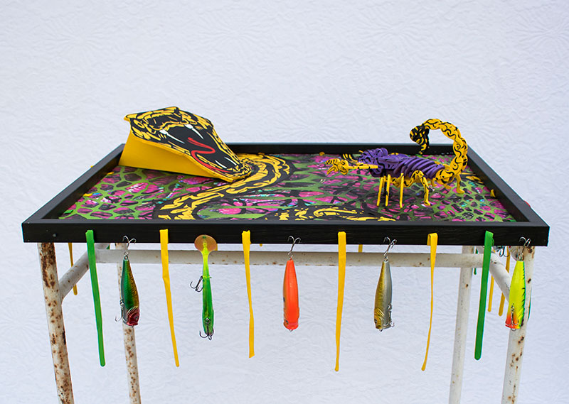 Dóczi Attila: Future Fux with tattoed 02 | 2019 | farost, hungarocell, fém, műanyag, akril, spray 45x160cm | Fotó: Zaklajda Dániel
