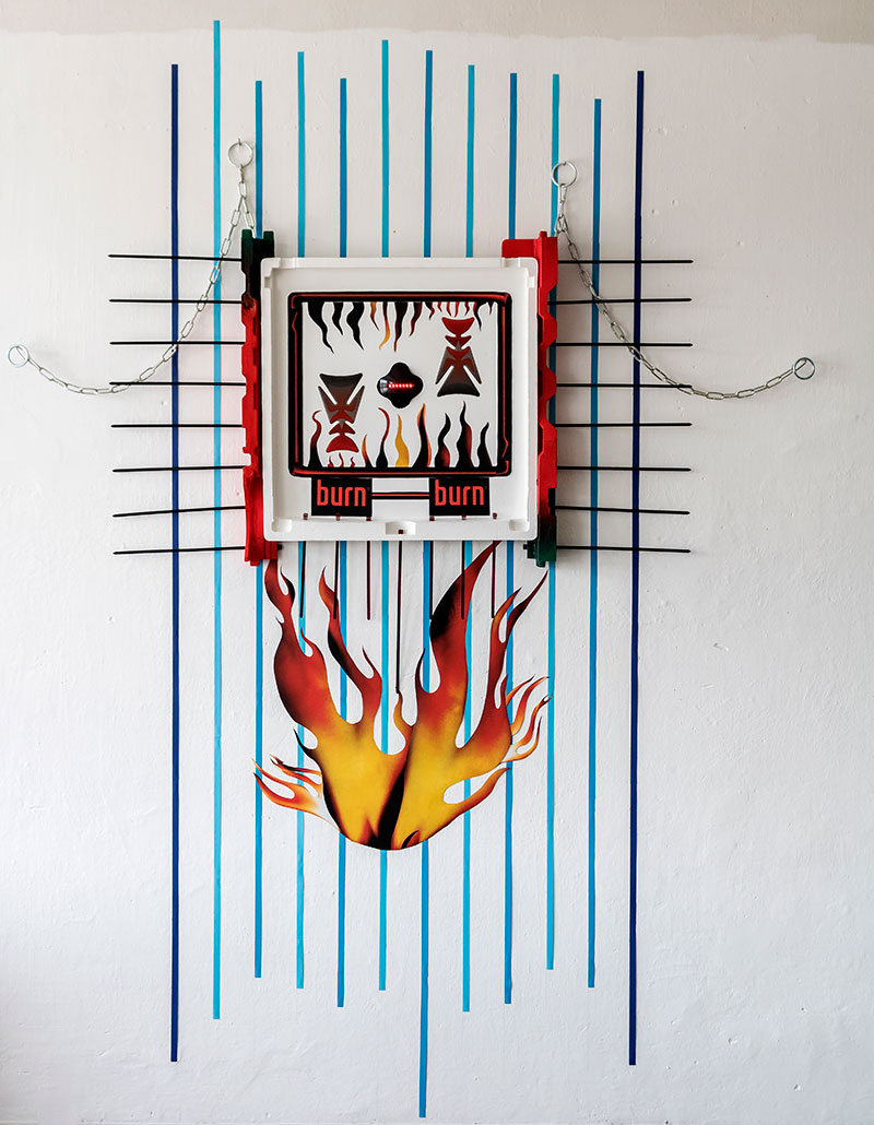 Dóczi Attila: Trophy Burn | 2019 | hungarocell, plakát, akril, spray, műanyag, fém, led | 160x210cm | Fotó: Zaklajda Dániel