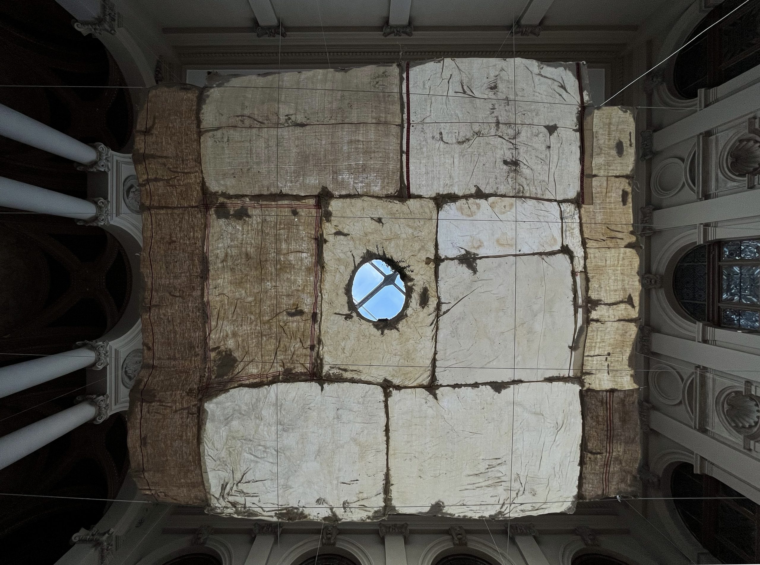 Horváth Rita: Baldachin ╱ 2023 ╱ enyvezett vásznak, moha ╱ 450×420 cm