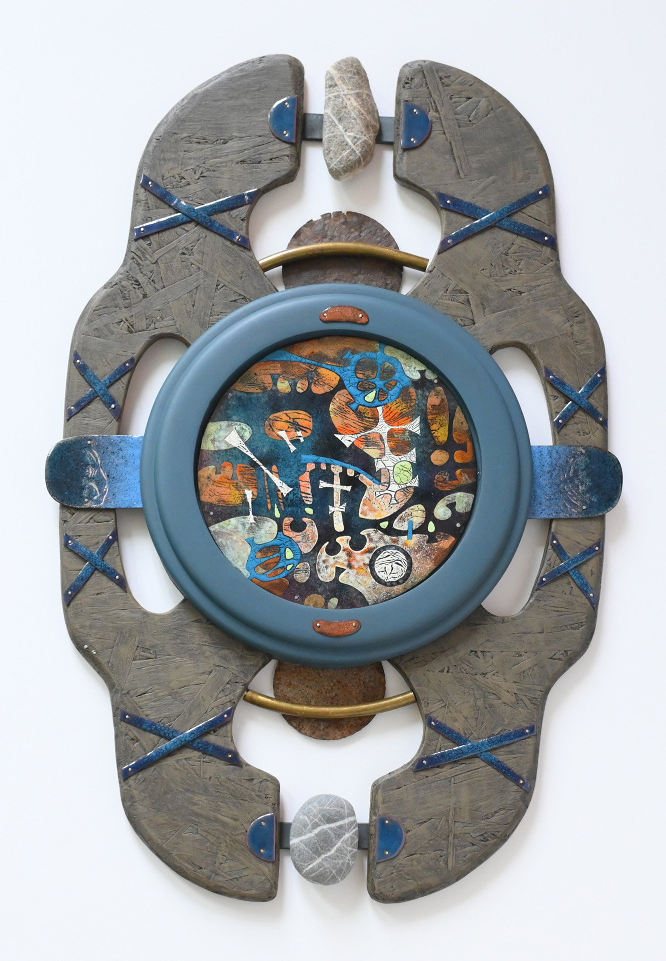 Ehhez az örökséghez kapcsolódik a Hajdúsági Nemzetközi Művésztelep, amely 1963 óta folyamatosan működik, így a legrégibb megszakítás nélkül fennálló magyar alkotótáborok egyike. 1977-től az UNESCO által jóváhagyva viseli a „nemzetközi” jelzőt, és az elmúlt fél évszázadban a világ minden tájáról megfordultak itt művészek – a Hajdúböszörményben készült és örökül hagyott munkáik a helyi gyűjteményt gazdagítják. Ezek közül most persze csak néhány látható, köztük az orosz Anastasia Vdovkina egyik applikált tűzzománca, amely a totemisztikus-animisztikus hitvilágú közösségek rituális tárgyait idézi fel rá jellemző módon. A Fogyatkozás (2023) cím egy égi jelenségre is utalást tesz, azt sugallva, a világok közti kapcsolat fenntartását a sámánok helyébe lépve talán a művészek is szolgálhatják.