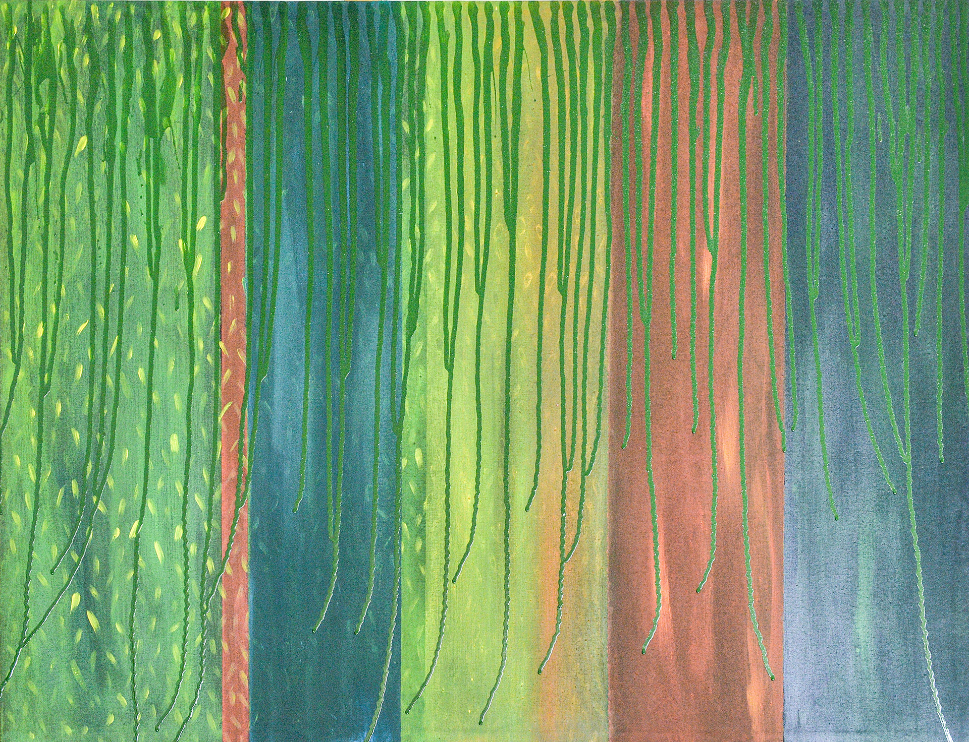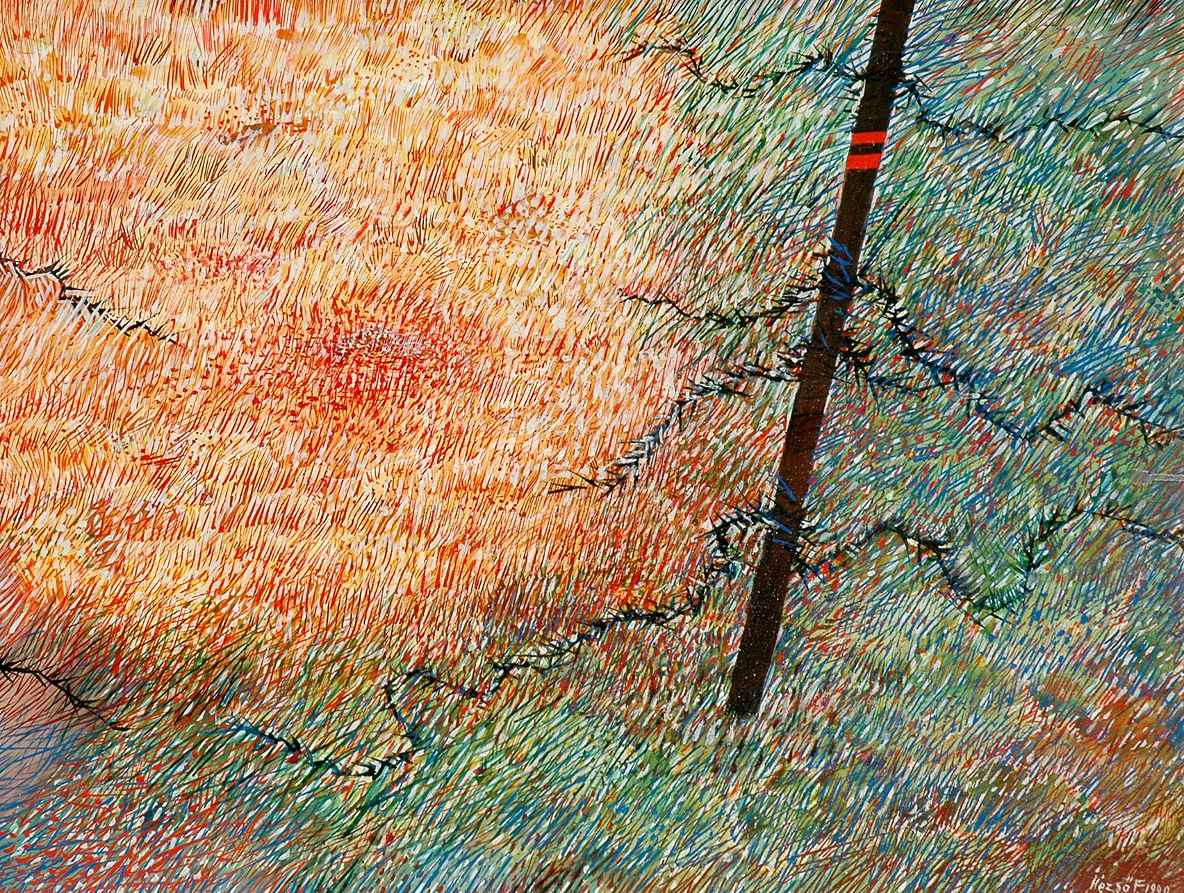 A hagyományos perspektívától ellépő madártávlati ábrázolás ad lehetőséget arra, hogy a téma helyett az anyagszerűségre terelődjön figyelmünk Hézső Ferenc Zónáját (1990) látva. A különböző színű, ívelt vonalak keresztezése egy vibráló színmezőt eredményez. Az aszimmetrikus kompozíció elevenségét növelik a törésvonalszerű fekete indák, valamint a füves talajból kiemelkedő, azonosíthatatlan objektum is, amely mintegy a kép nonfiguratívként értelmezése irányába terel, és szintén a határképzésben érdekelt. A vajdasági származású, élete utolsó időszakát viszont Debrecenben töltő Torok Sándor Kompozíció I-e (1992) a rá jellemző módon nyit kozmikus távlatokat, a dinamikus képi struktúrák mozgalmassága mögött mintha mégis ott munkálna valamiféle tájélmény. A művésztelep jelenlegi vezetője, Rácz Imre által jegyzett Épülő város (2025) sem törekszik az épített környezet közvetlen felidézésére, inkább csak a vertikális hangsúlyok, az égi-földi szféra kontrasztos fény-árnyékhatásokkal való megkülönböztetése tesznek tanúságot a városképi inspirációról, amelyhez az ecsetkezelés mozgékonysága társul.