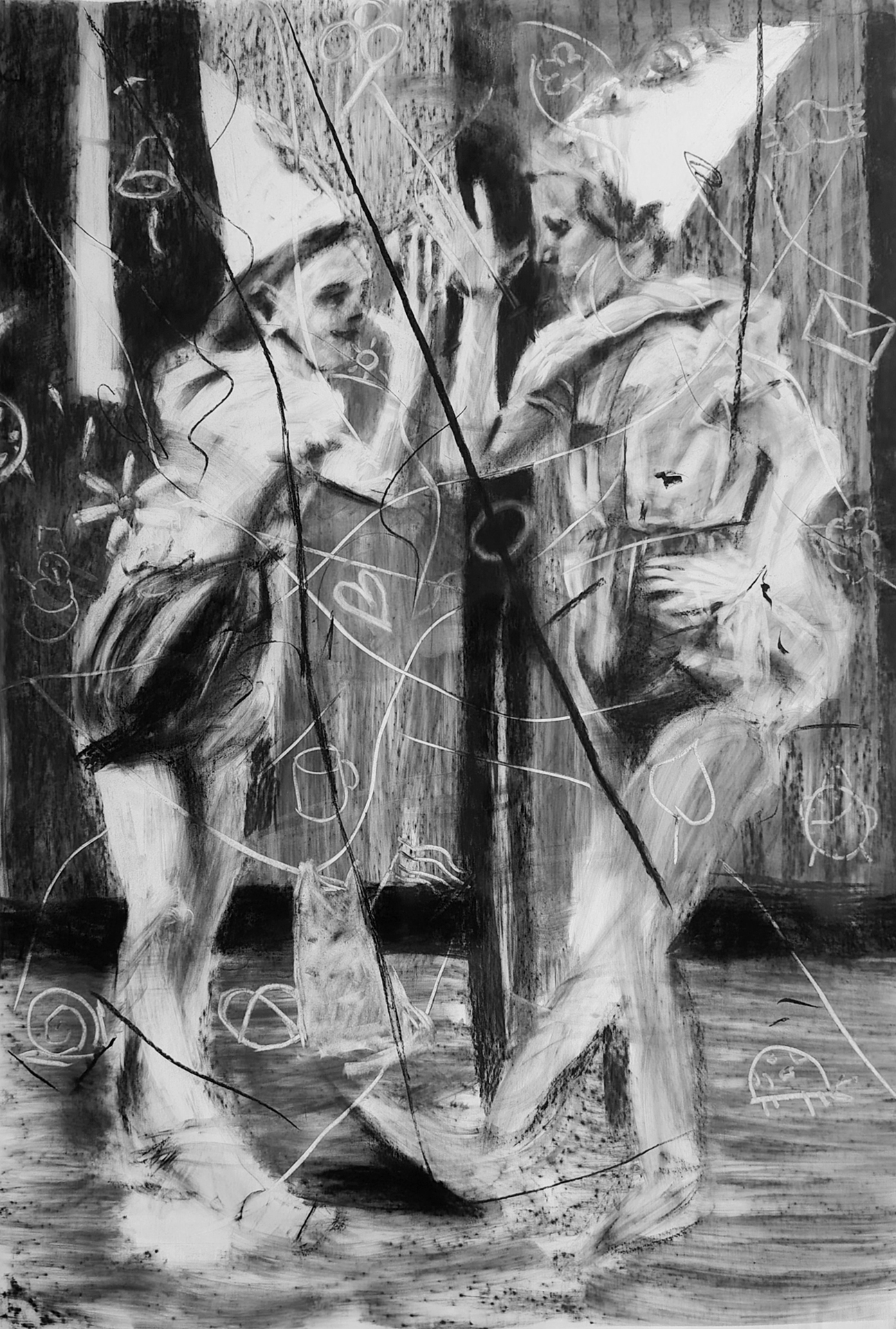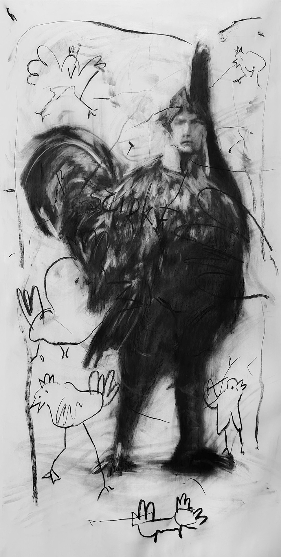 Lépcsőkön kanyarogva érek le a pinceszintre, ahol nagy méretű fehér vásznakon fekete színű szénrajzok fogadnak. Az első teremben, rögtön jobb kéz felől egy álló formátumú mű, amely egy fiatal férfit ábrázol tagadhatatlanul csirkének öltözve, másfelől farsangi jelmeznek is hat, kissé szúrós tekintettel néz el valahova, a fejünk felett, a messzi távolba.