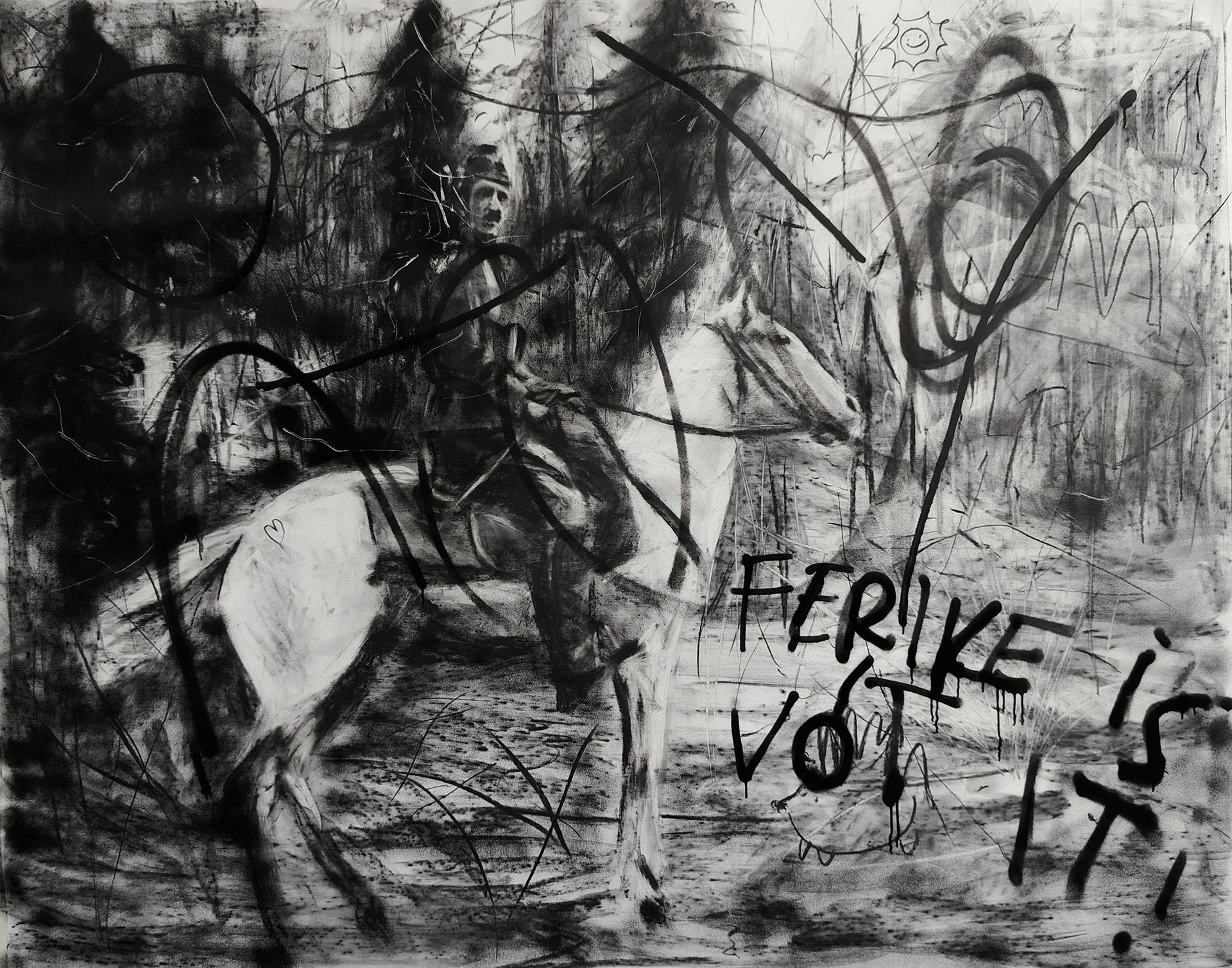 Méretét tekintve lenyűgöző a következő alkotás, mely szintén egy talált fotó alapján készült, I. világháborús katona ül fehér lován, távolban fenyves; a művész nem enged belerévedni bennünket a háború borzalmaiba, feloldja a látványt a ló farára rajzolt apró szívecskével, és hogy még inkább fokozza a hatást, a fenyves túloldalára skiccel a McDonald’s logóját és épületrészletét. Ebben a térben az idő nem lineáris, hanem egymásra torlódó, egymásba olvadó „időtengelyek” mentén halad át, a múlt újraíródik vagy felülíródik a jelen pillanataival.