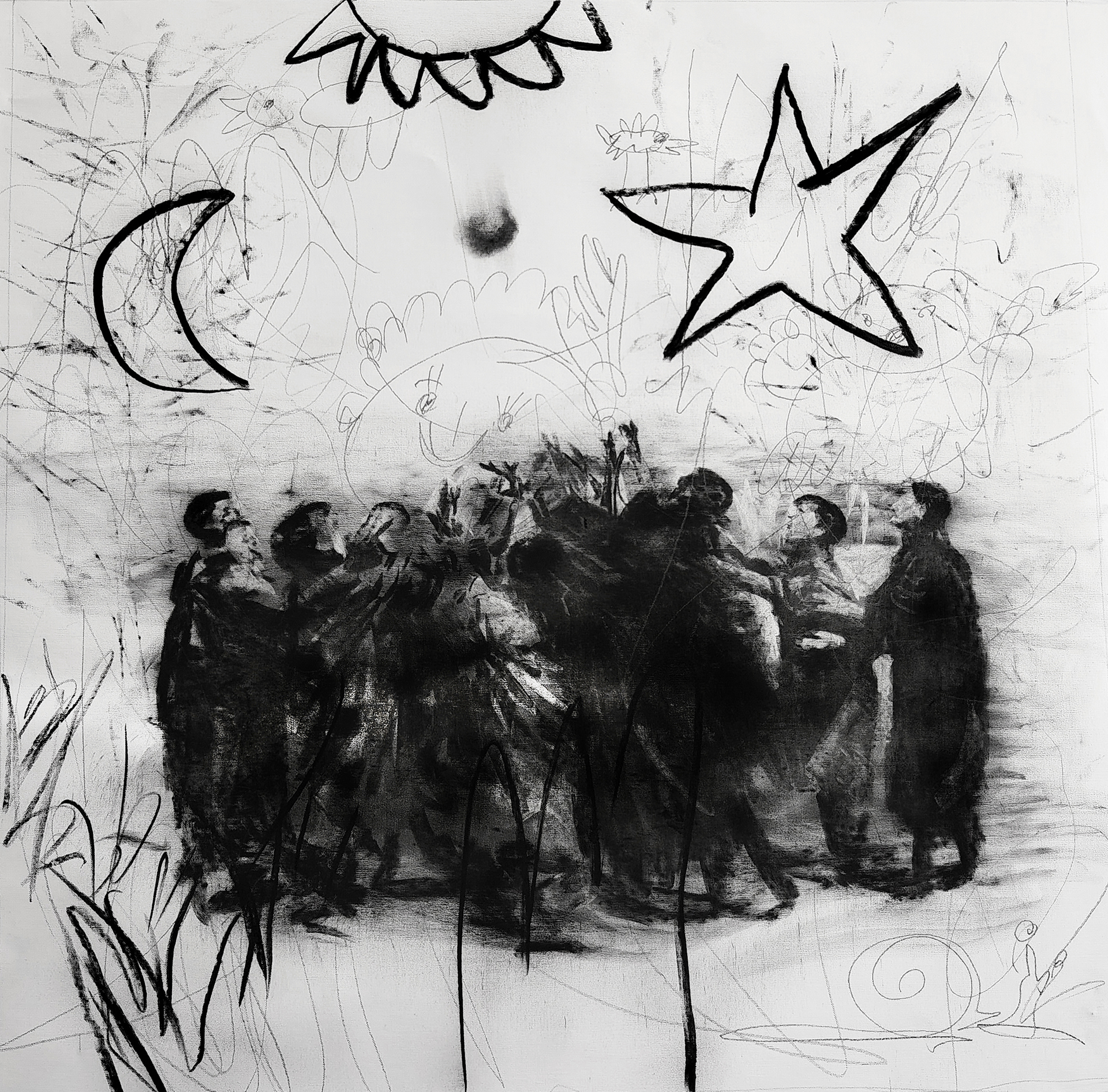 Határ Attila: Figyelők ╱ 2026 ╱ szén, pitt, vászon ╱100×100cm
