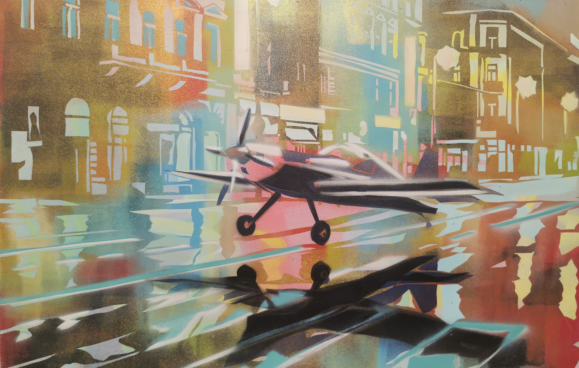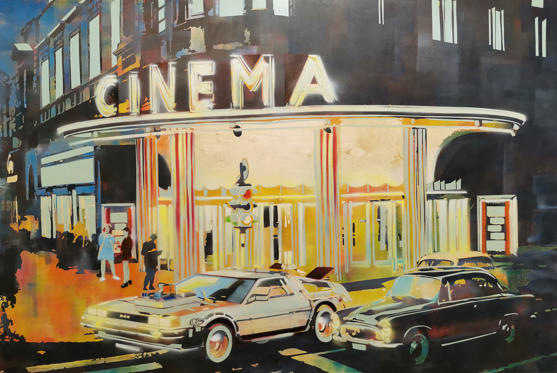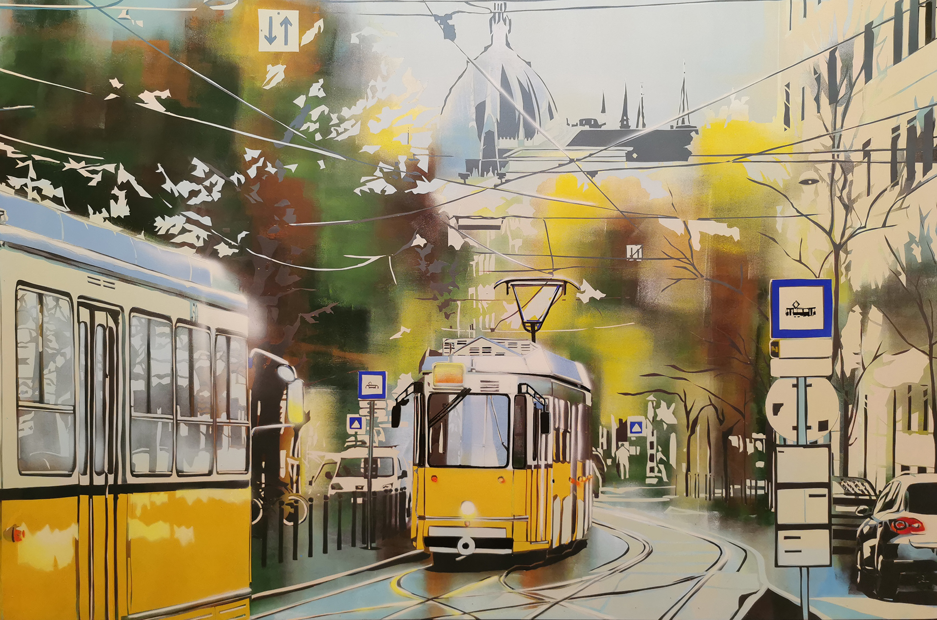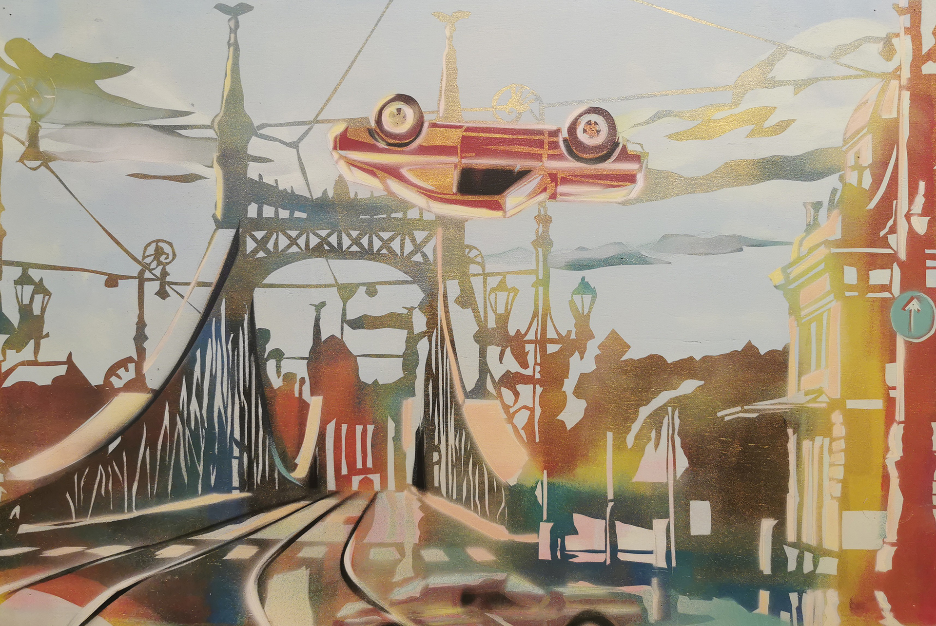 A megdermedt időben így hirtelen van időnk elidőzni a gravitációnak feszülő fém csillogásán, a tökéletes íveken. Ezzel a gesztussal – ahogy a glamúrral és az akcióval átitatott témát sajátos, stenciles-fújt technikájával megalkotja – egy csapásra megszünteti a határt az „elit” és a „pop” művészet között. Arra emlékeztet minket, hogy ez a hatalmas betonrengeteg, Budapest utcái és felüljárói valójában egy óriási filmdíszletet alkotnak, amely kreatív történetek végtelen lelőhelye.