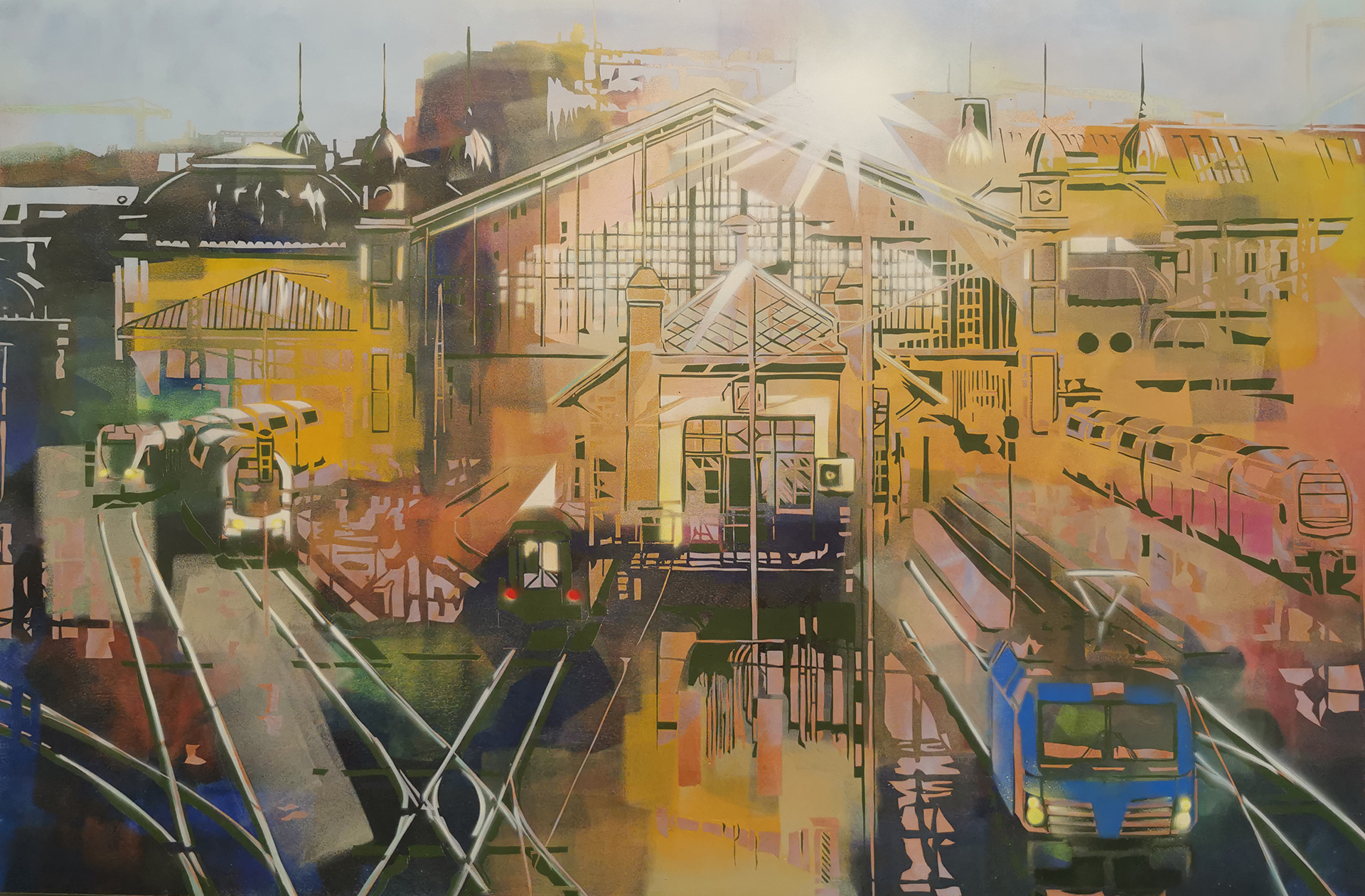 Ott van a mérnöki pontosság, a szabályos rend: az acél, a beton, a végtelenbe futó párhuzamosok – a társadalom és a technológia által ránk kényszerített rideg keretrendszer. Ugyanakkor beömlik ebbe a térbe valami megzabolázhatatlan, álomszerű lágyság. A határozott élek és vonalak szinte feloldódnak a festék párás, vibráló ködében, mintha a racionális városkép ellenállhatatlanul csúszna át a tudatalattinkba.