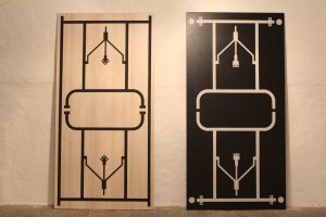 A megnyitószituáció után, a szem becsapásának szórakoztató zavarán túl viszont úgy képzelem, hogy e mű kissé modorossá válik, amire a cím csak ráerősít, hiszen kisimul az időképzet. A kellő kitartással, jól adagolt geg azonban szinte észrevétlenül válik komollyá – ez a regiszterváltás Gerber Márton kiállításának a legnagyobb erénye. Az Oltár című installáció asztala mellett az Asztrakt és Absztal névre hallgató festmények is hasonló, ám finomabb játékot űznek elvárásainkkal, a lábak rajzoltak, ám az asztallapfestmény tekinthető valódi asztallapnak. A két festmény a precíz és inverz rajzolatokkal egyszerre kínálja az iróniát és a világra való vállaltan naiv rácsodálkozást, a konceptualizmus és a festőiség közös játékterét. A hiányzó, felületbe olvadó asztallábakra hajaz az Ajándék című mű két összebarkácsolt lécből álló stilizált lába, de ezen a nyomon haladva a Szenvedés eszközei címet viselő és a hátán hímzett töviskoszorús emblémát hordozó farmerdzseki harapófogójában is egy kéz nélküli figurát pillantottam meg először. Mindezzel azt kívánom mondani, hogy Gerber Márton belakta az Óbudai Társaskör pincéjét, szelíden terelgeti a befogadókat, művei kommunikálnak a nézőkkel és kommunikálnak egymással. Nem válnak egy művé, de egységesek, noha mediálisan sokfélék, installációk, szobrok, táblaképek, objektek. Egymással finoman suttognak, s csak néhány esetben mondanak túl sokat, vagy beszélnek túl hangosan. Az összhatás szempontjából ezek alapján kilógónak érzem a három hüledező, stilizált portréarcot és főleg a letakart test fényképét. Közös jegyük még, hogy a művek címei mind kérdésformát öltenek. A falon szépen tükröződő transzparens portrék a képolvasást megzavaró nyelvi információ példái, a nyelv és a kép transzparens viszonyának lehetetlenségét demonstrálják, a fényképpel azonban (Ki vagy?) úgy vélem, tényleg nehéz mit kezdeni (na ki lenne?).